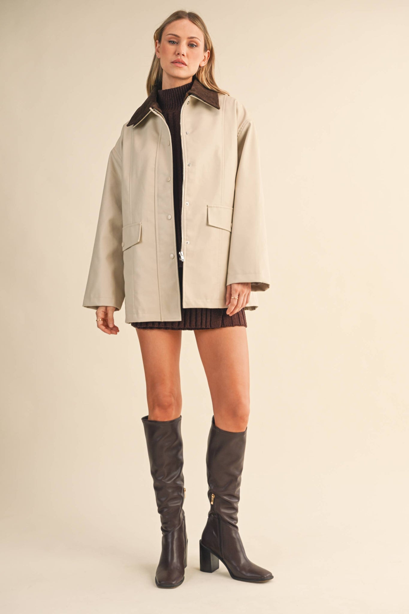 This oversized jacket features soft faux leather and a detachable corduroy collar, combining style and versatility for your wardrobe.