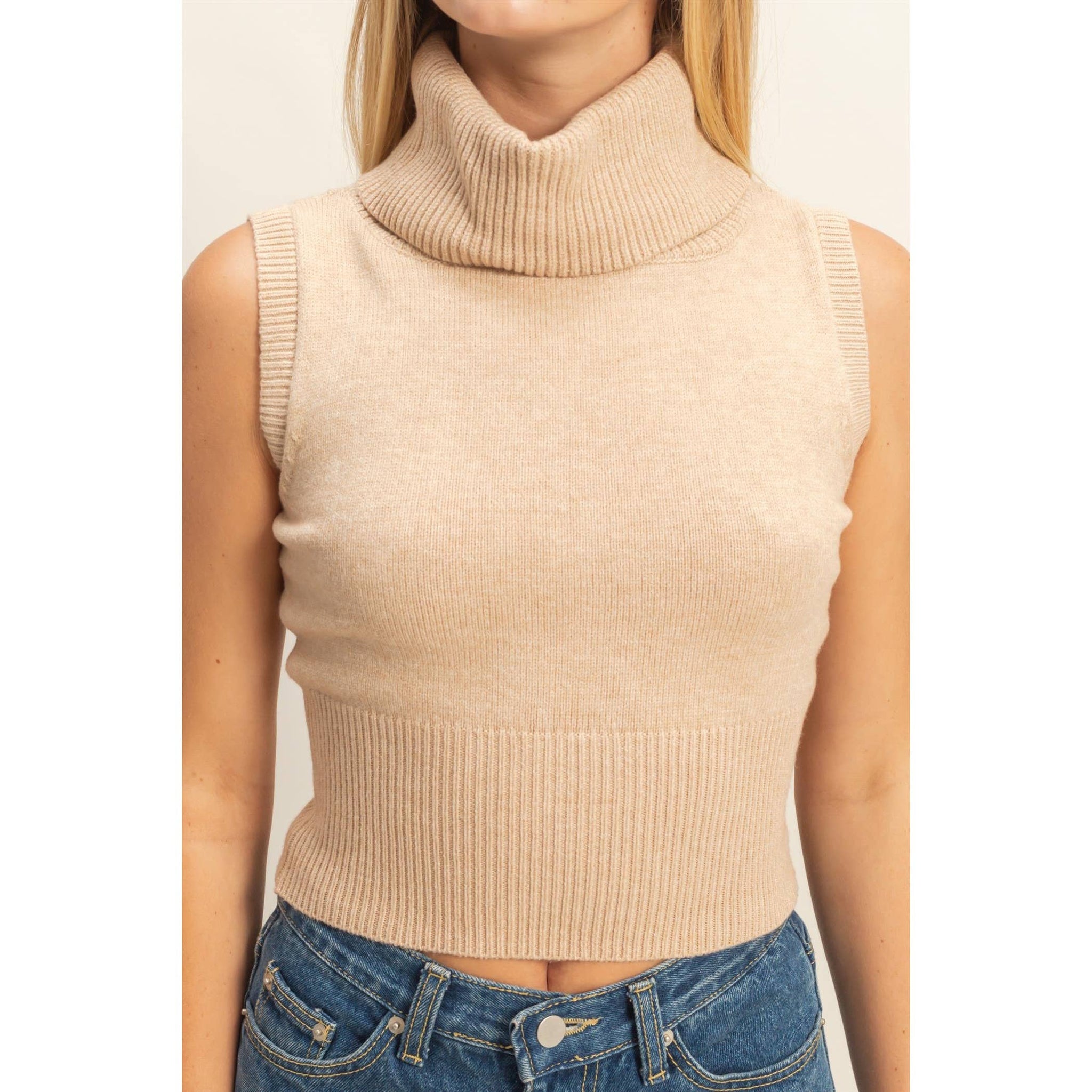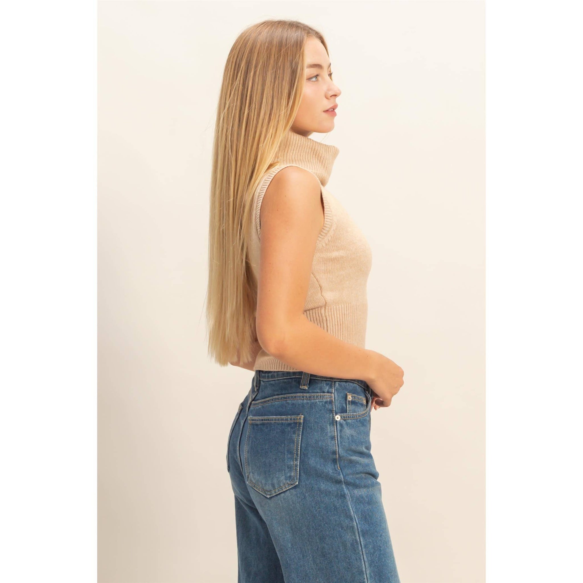 This fitted sleeveless sweater with a turtleneck collar merges sophistication with comfort, ideal for layering. The ribbed knit pattern enhances the silhouette, making it a versatile addition to any wardrobe. Perfect for a casual day out or a refined evening layer.
