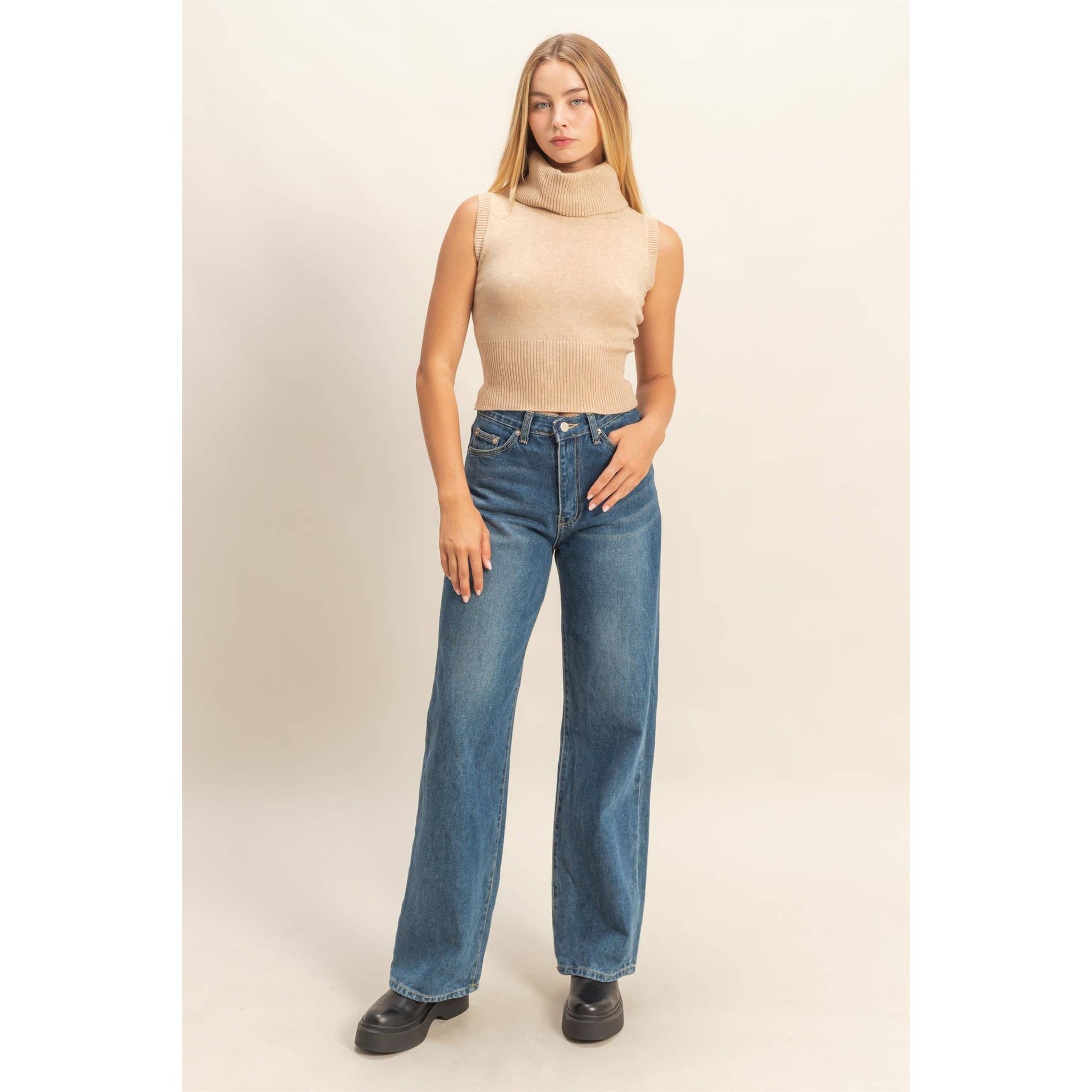 Woman wearing a beige sleeveless sweater and blue jeans against a plain background